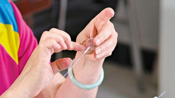 More than 10 steps — including selecting and melting glass, blowing glass beads, coloring, waxing, frosting and assembling — are required to make glass grapes. All steps require manual skills, and all efforts are wasted if the slightest mistake is made during any of the steps. Blowing the glass beads is the hardest step, says Chang Hong. First, she blows molten glass, through a metal tube, to make a glass tube. Then, she blows molten glass, through the glass tube, to make a hollow glass bead. She has to repeat the two steps constantly. The molten glass is hotter than 1,500 C, and a glass bead must be blown within seconds, which requires the artisan to take extreme care, and to use proficient skill.