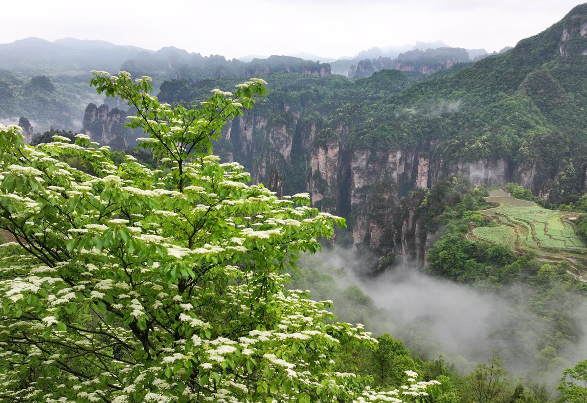 Following rainfall, the airborne farmland scenic area of Zhangjiajie National Forest Park in Hunan province transformed into an ethereal wonderland on Monday.