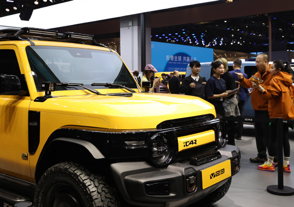 Visitors talk beside an iCAR V23 at the 21st Shanghai International Automobile Industry Exhibition in East China's Shanghai, April 23, 2025. [Photo/Xinhua]