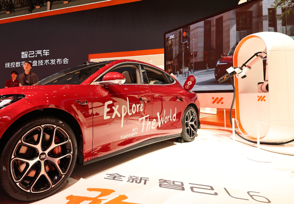 A robotic arm helps charge a car by IM Motors during a demonstration at the 21st Shanghai International Automobile Industry Exhibition in East China's Shanghai, April 23, 2025. [Photo/Xinhua]