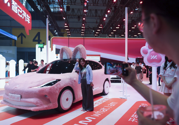 A visitor poses for photos with a car on display during the 21st Shanghai International Automobile Industry Exhibition in East China's Shanghai, April 23, 2025. [Photo/Xinhua]