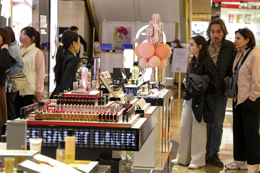 Foreign tourists visit a cosmetics outlet in a shopping mall in Shanghai on April 4. [CHINA DAILY]