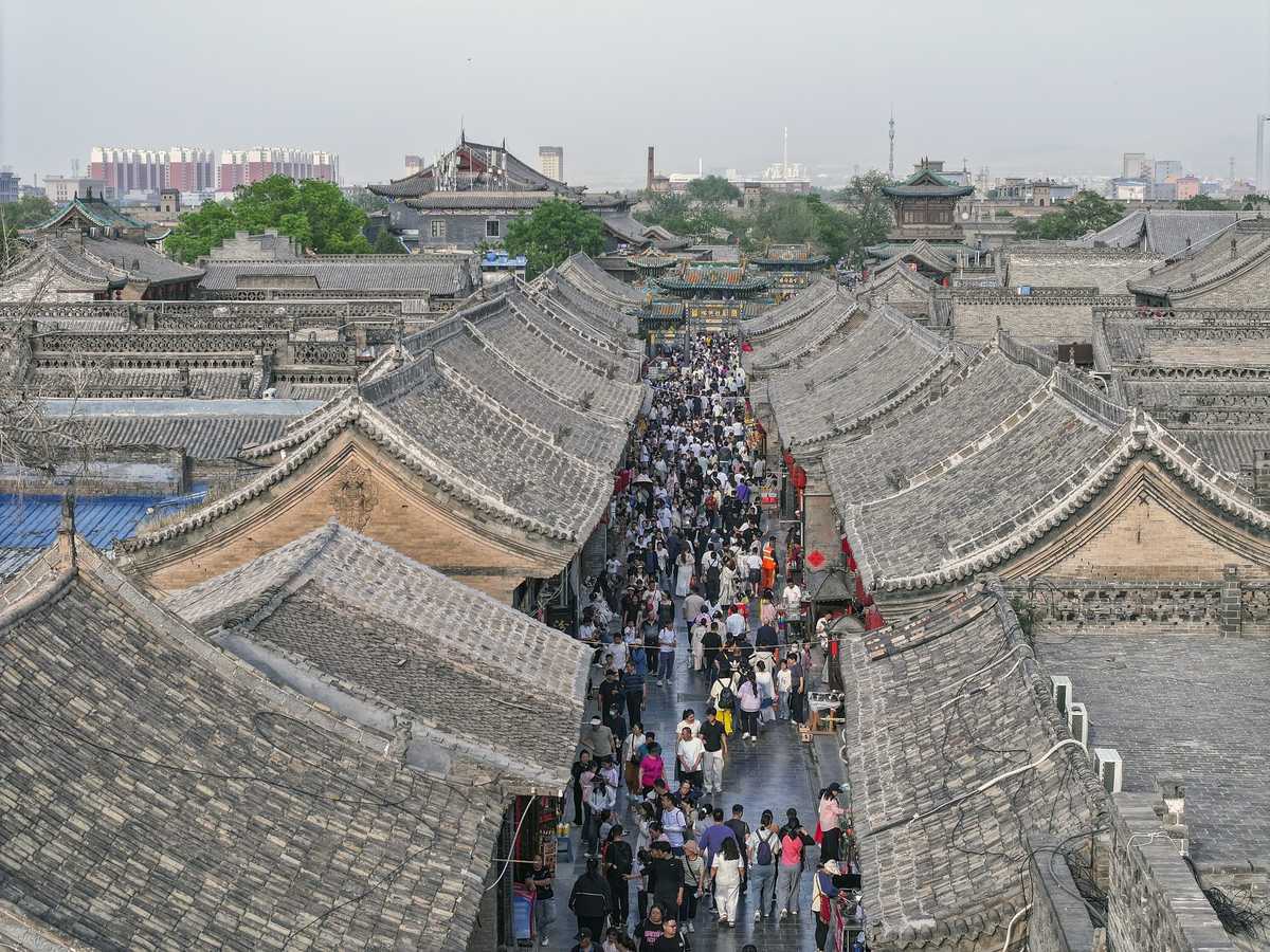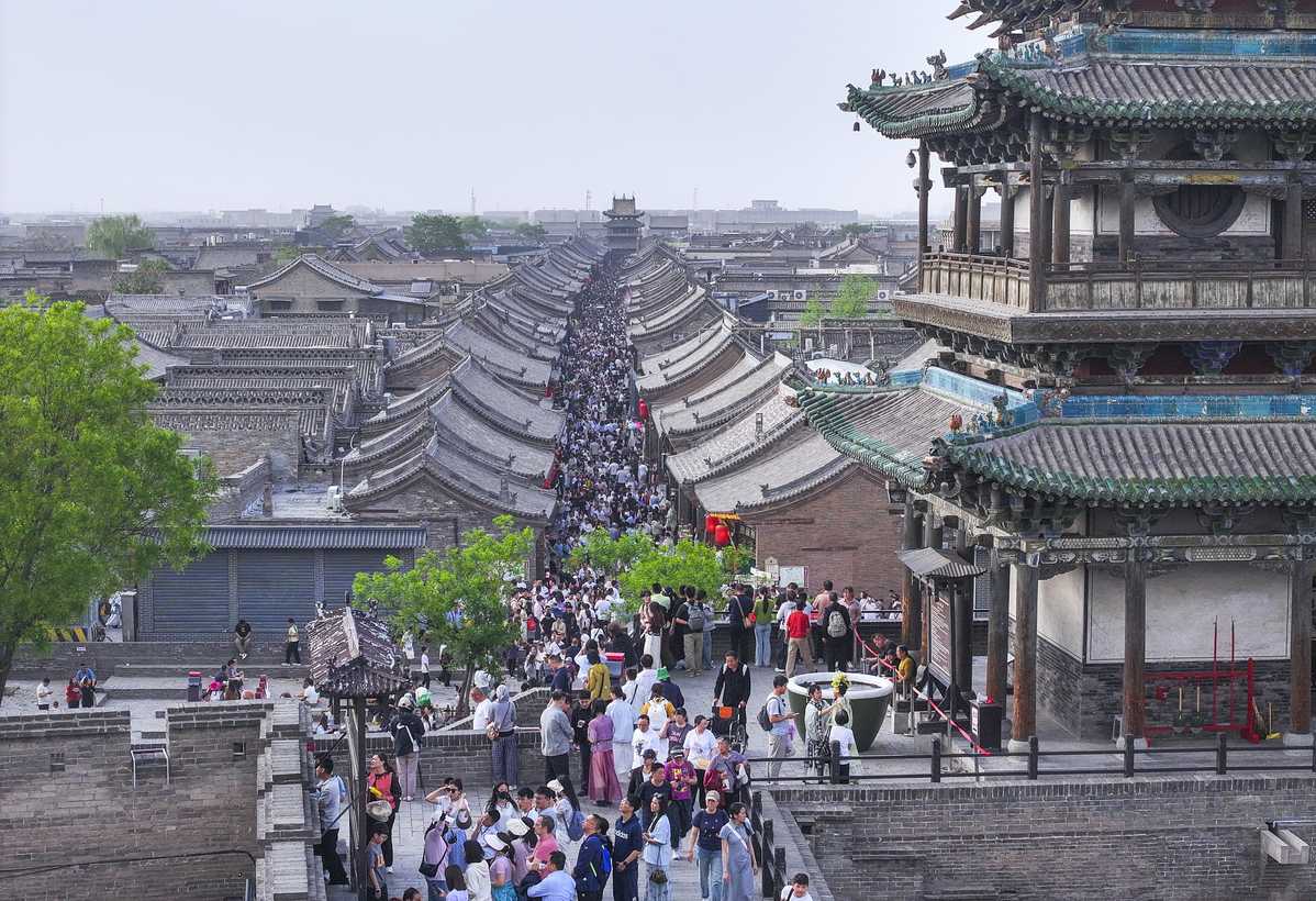 Tourists enjoy their holiday at Pingyao Ancient City in Jinzhong, North China's Shanxi province, on May 2, 2025. The tourist flow is at its peak, as the alleys and scenic spots in the ancient city are crowded with visitors. According to statistics from the local culture and tourism department, over 70,000 visitors were received here on May 2, 2025. [Photo by Liang Shengren/For chinadaily.com.cn]