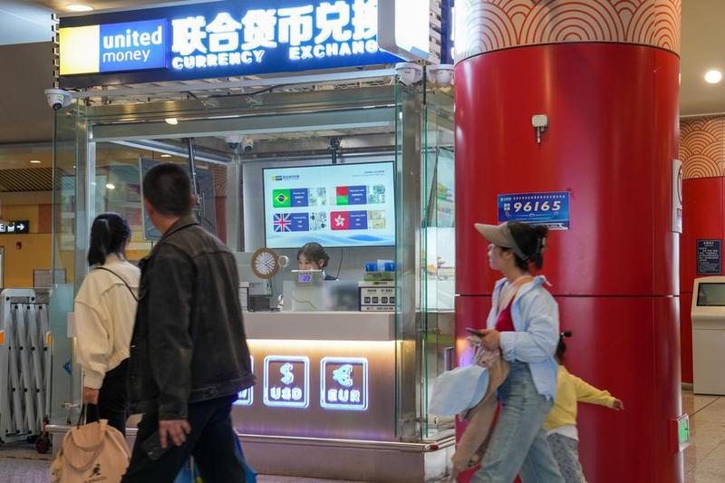 People walk past the Currency Exchange in Wangfujing station of Beijing Subway Line 8 in Beijing, capital of China, April 28. [Photo/Xinhua]