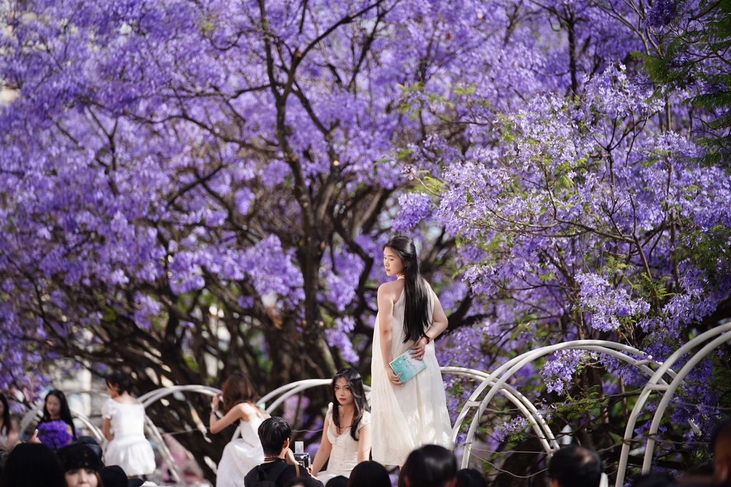 During the Labor Day holiday from May 1 to 5, the jacarandas in Kunming, Yunnan province, were blooming, attracting residents and tourists to capture the romantic scene.
