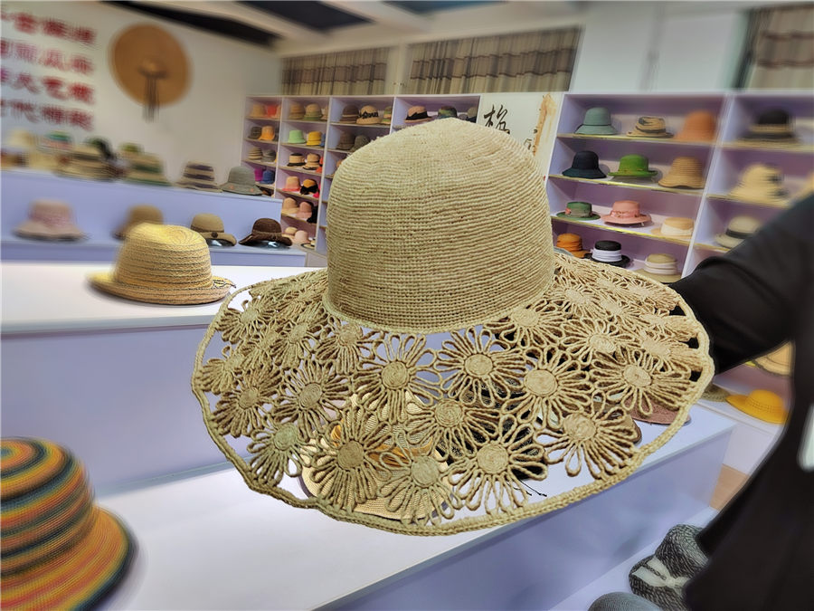 The sales manager Yang Qian presents a high-end straw hat with a complex production process. [Photo by Bi Nan/chinadaily.com.cn]