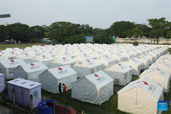 This photo taken on May 10, 2025 shows China-donated tents in a relief shelter in Mandalay, Myanmar. [Photo/Xinhua]