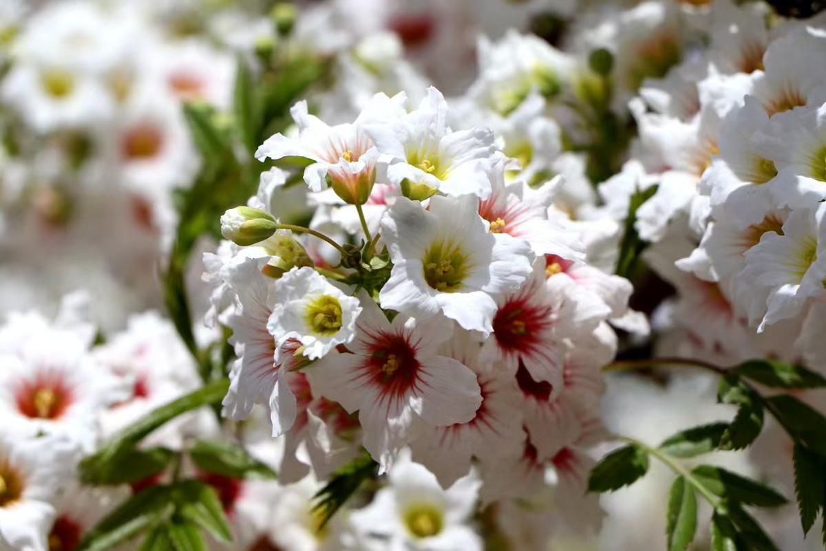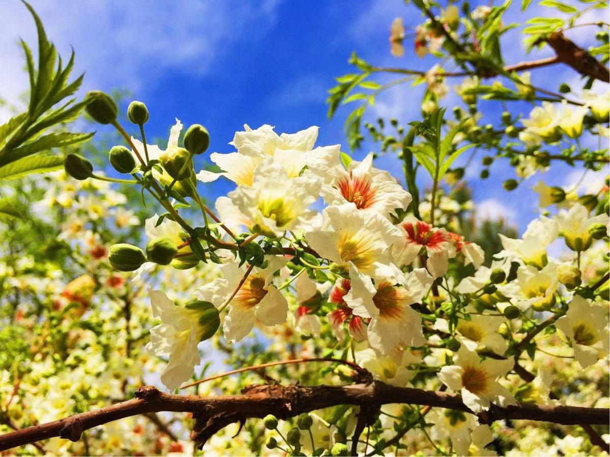 The shiny-leaved yellowhorn trees at an institute in Zhangye, Gansu province, recently entered their peak flowering period, adding a touch of elegance to the early summer desert.