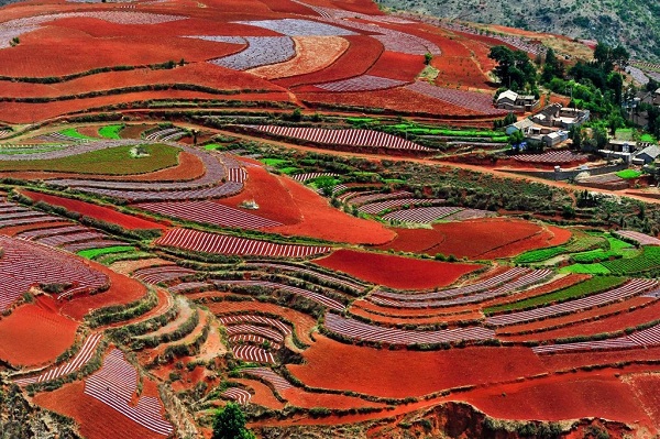 Another recommended location in remote Kunming is the Dongchuan red land. Dongchuan red land is about 250 km northeast of Kunming. At an altitude of 1,800-2,000 m, the red soil is rich in iron and aluminum, giving it an amazing crimson color. The soils are interspersed with colored fields and crops, forming all kinds of brilliant patterns.