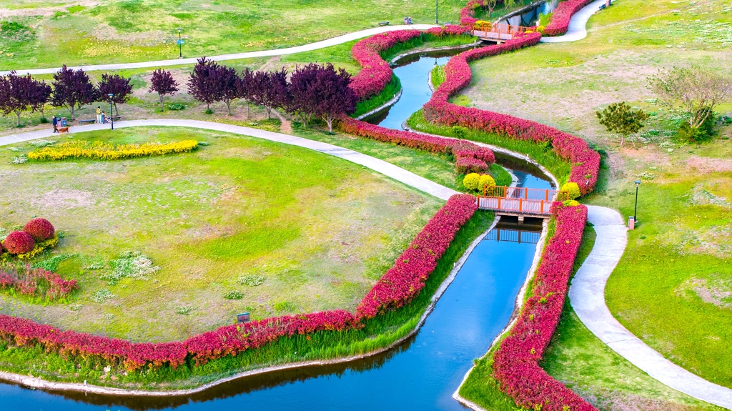 At the Citizens’ Sports Park in the West Coast New Area, Qingdao, Shandong province, the winding shoreline of the park’s scenic water system is beautifully adorned with stretches of red photinia bushes. Resembling a radiant “red necklace”, the vibrant foliage thread together the park’s picturesque landscape, creating a striking view.