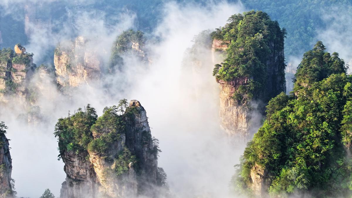 On Monday, as dawn broke over the karst mountains of Zhangjiajie National Forest Park in Hunan province, an otherworldly spectacle unfolded thanks to the intermittent rainy weather.