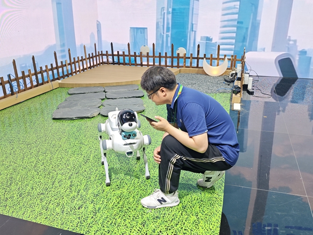 A man checks out a robot dog during the 8th Digital China Summit. [Photo provided to gofujian.com]