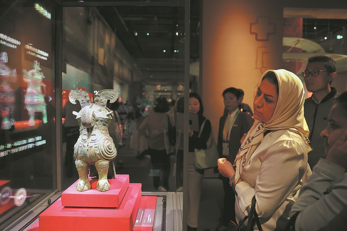 Visitors admire a bronze zun ritual vessel that dates back to the Shang Dynasty (c.16th century — 11th century BC) while perusing the This is the Shang exhibition at the Grand Canal Museum of Beijing on Sunday. JIANG DONG/CHINA DAILY