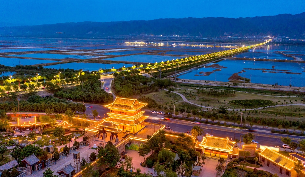 In Yuncheng, Shanxi province, the Salt Lake scenic area dazzles at night. The radiant lights mirrored on the surface of the Salt Lake create a breathtaking and picturesque scene.