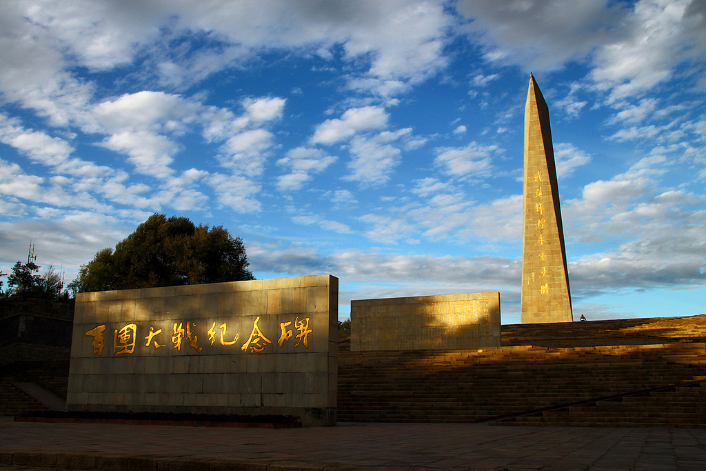 Located atop Shinao Mountain, 10 kilometers southwest of downtown Yangquan in Shanxi province, the Hundred Regiments Offensive Monument rises into the sky like a sharp bayonet. This magnificent monument faces south and comprises a main stele, three auxiliary steles, a large circular sculpture, two inscribed steles, four beacon towers, and a 227-meter-long winding Great Wall-style structure.