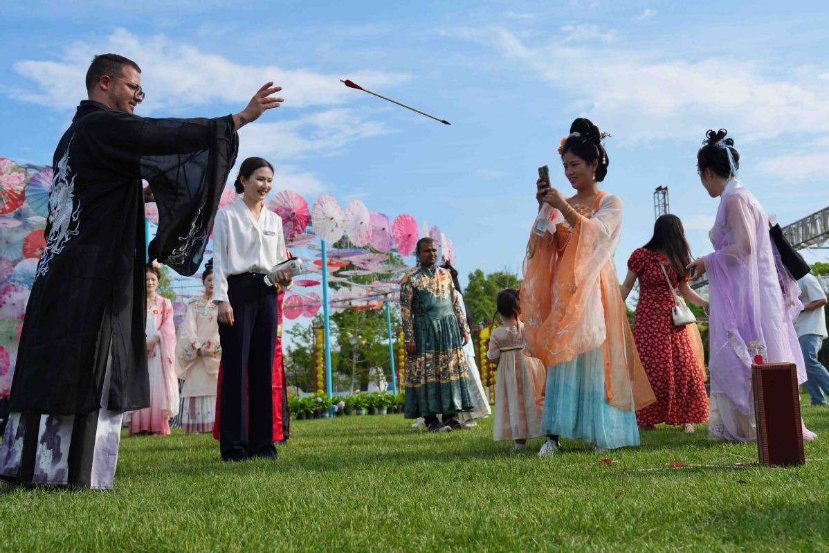 At Yunlan Bay's Four Seasons Flower Field, the visitors wore various styles of Han and Tang clothing, which are traditional attire from the Han (206 BC-AD 220) and Tang (618-907) dynasties, evoking the image of ancient Chinese scholars. Guided by instructors, they took part in traditional Chinese games such as archery, pitch-pot (touhu), and cuju (ancient soccer).