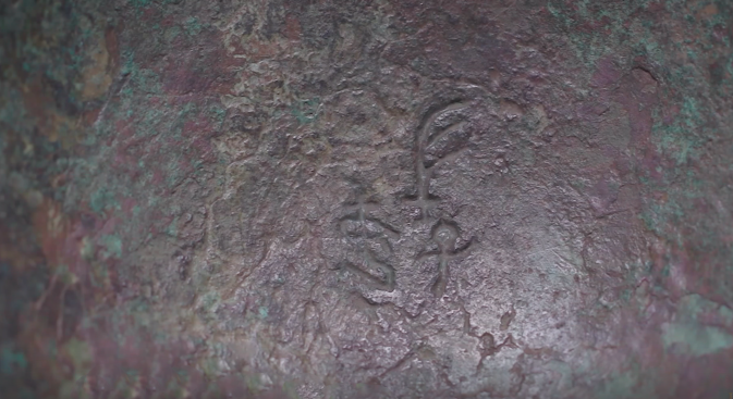 Close-up of the two Chinese characters "Fu Hao" cast inside the