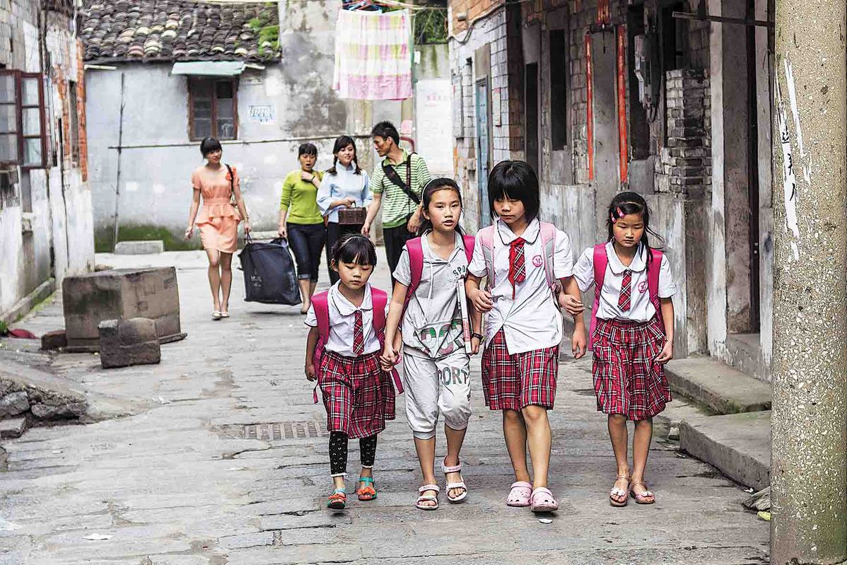 Primary school students walk in the Wanshou Palace historical block in 2012. [Photo provided to CHINA DAILY]