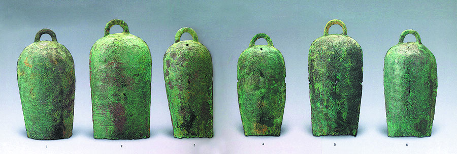 Yunnan-style Animal Pattern Bronze Chime Bells from the Western Han Dynasty (206 BC-AD 24), unearthed in Lixi town, Sichuan province, in 1977, are on display at the NCPA in Beijing. [Photo provided to China Daily]