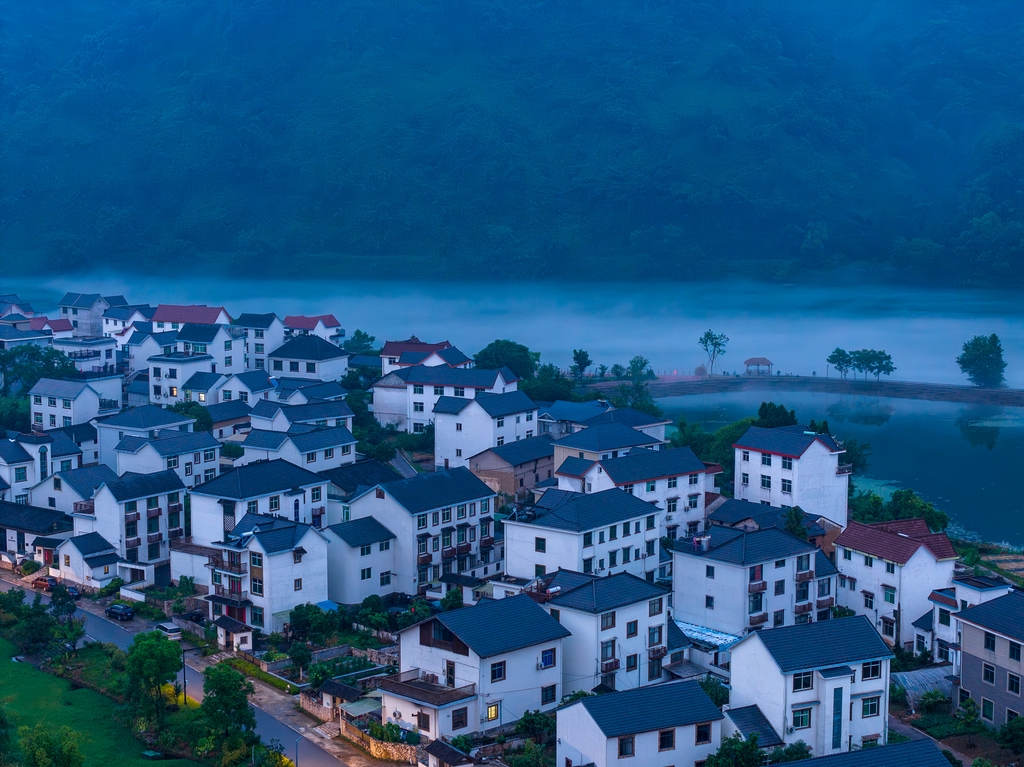 On June 7, a light mist draped over the river in Zhijiang village, Xiaya town, Jiande, Hangzhou, Zhejiang province. The soft fog blended beautifully with the green riverbanks and winding walkways, as distant mountains and quiet villages emerged like brushstrokes in an ink-wash painting.