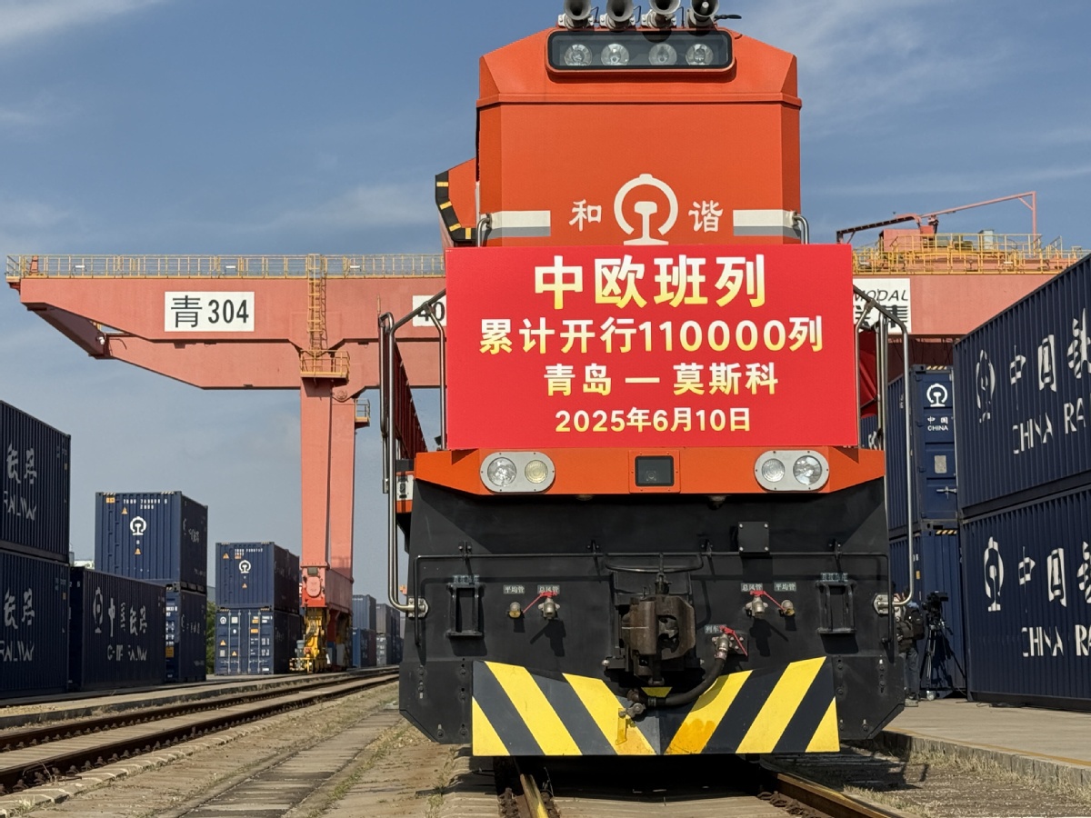 A freight train loaded with home appliances departs from Qingdao, Shandong province, for Moscow on June 10, 2025, bringing the total number of China-Europe freight train trips to 110,000. [Photo by Luo Wangshu/chinadaily.com.cn]