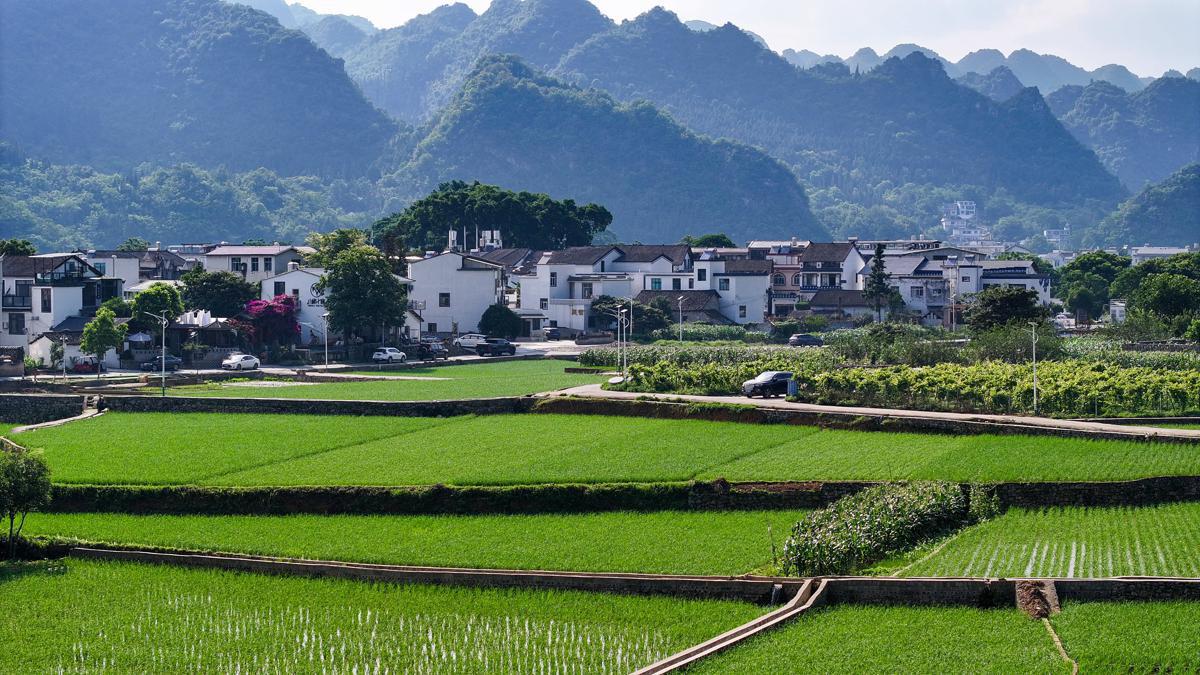 In the lush summer, the Wanfenglin scenic area in Guizhou province shines amidst karst landforms, where rice fields, villages, and roads intertwine. Pastoral life offers a unique charm here.
