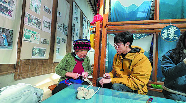 Zerin Moirangthem (right) learns traditional tie-dye techniques at a workshop in Dali, Yunnan province. [Photo provided to China Daily]