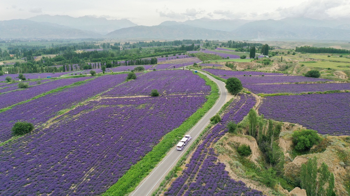 An aerial drone photo taken on June 14, 2025 shows a lavender field in Huocheng cunty, Northwest China's Xinjiang Uygur autonomous region. Vast fields of lavender in Huocheng county entered full bloom in June, transforming the landscape into a sea of purple. [Photo/Xinhua]