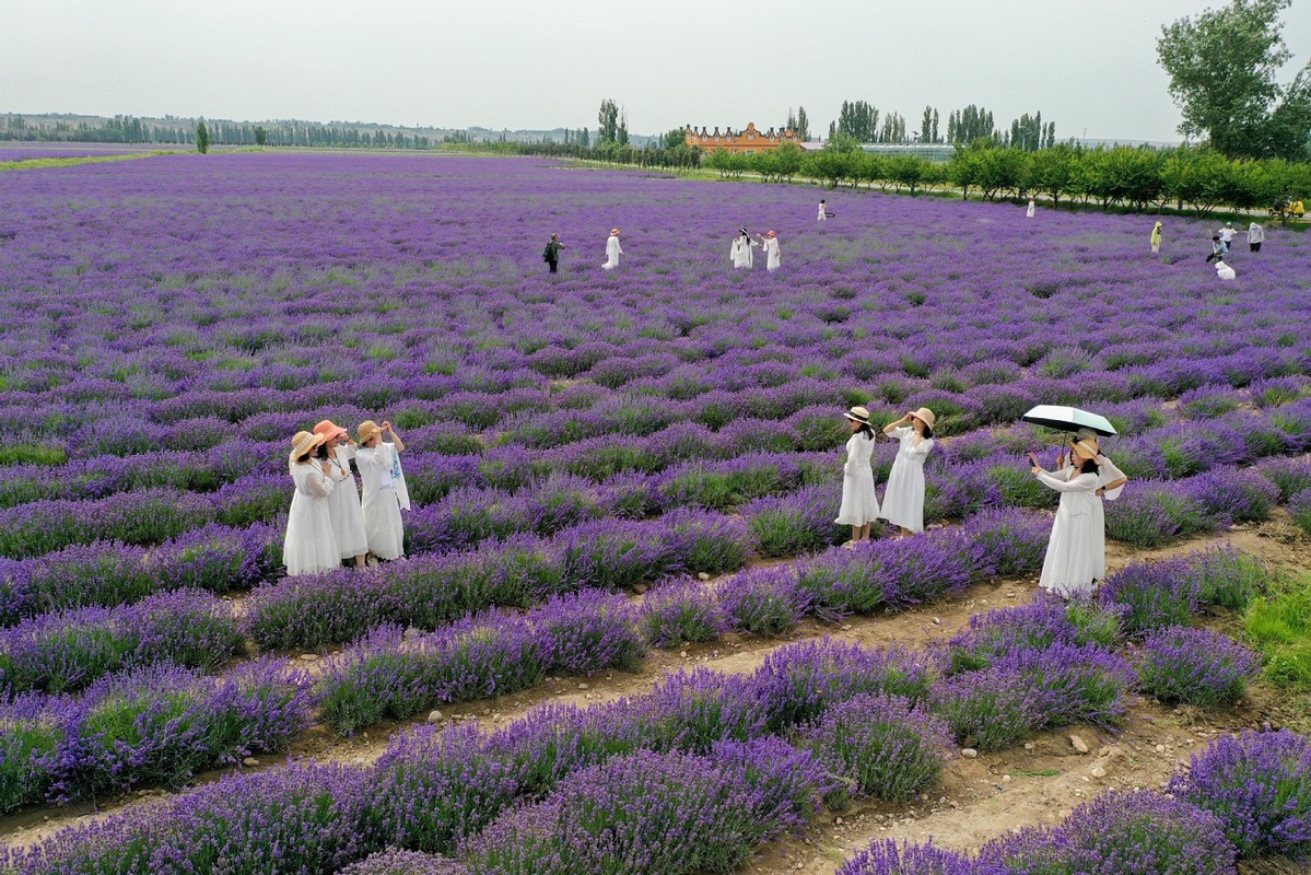 A drone photo taken on June 14, 2025 shows tourists visiting a lavender farm in Huocheng county, Northwest China's Xinjiang Uygur autonomous region. Vast fields of lavender in Huocheng county entered full bloom in June, transforming the landscape into a sea of purple. [Photo/Xinhua]