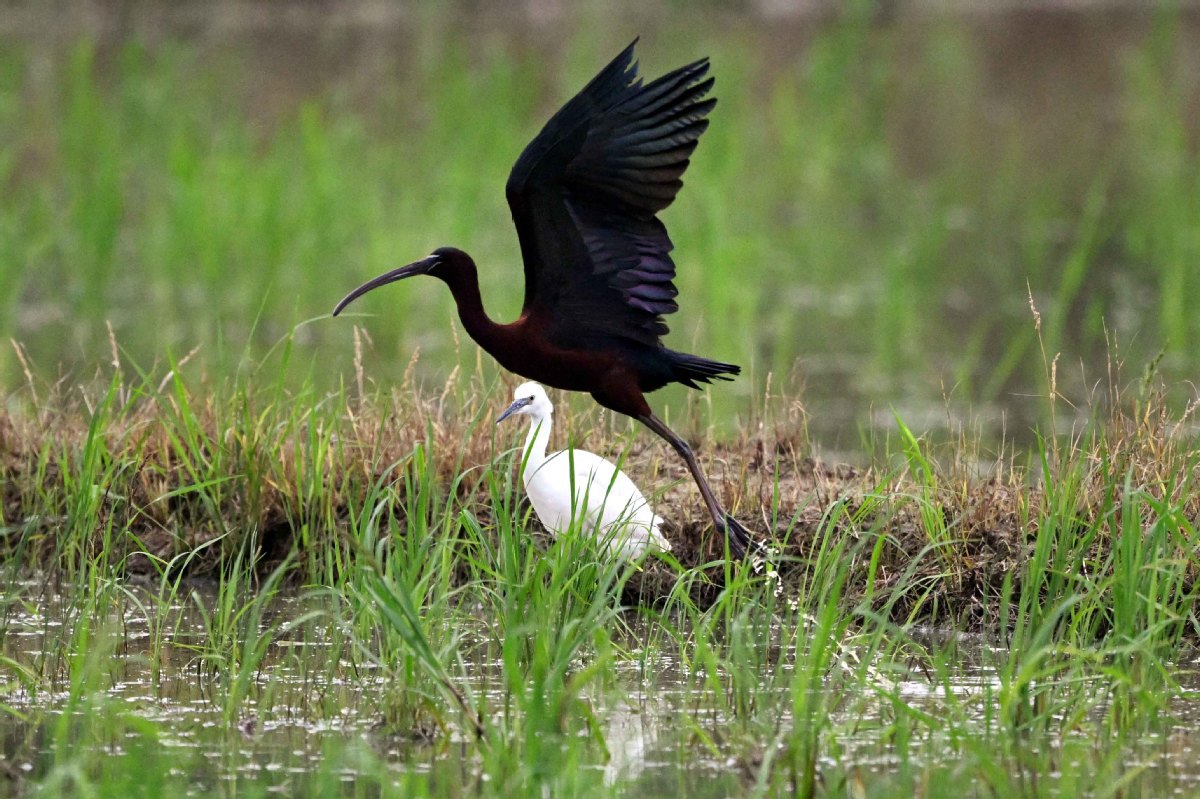 Glossy ibises are seen constructing nests in Jiangxi province in June. [Photo provided to chinadaily.com.cn]