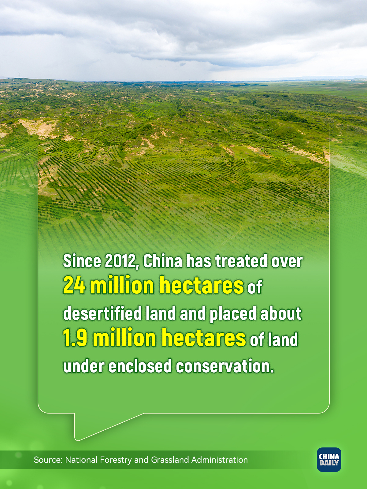 Since 2012, China has successfully implemented sandification control measures on over 24 million hectares of land and additionally placed almost 1.9 million hectares under enclosed conservation, according to the National Forestry and Grassland Administration.