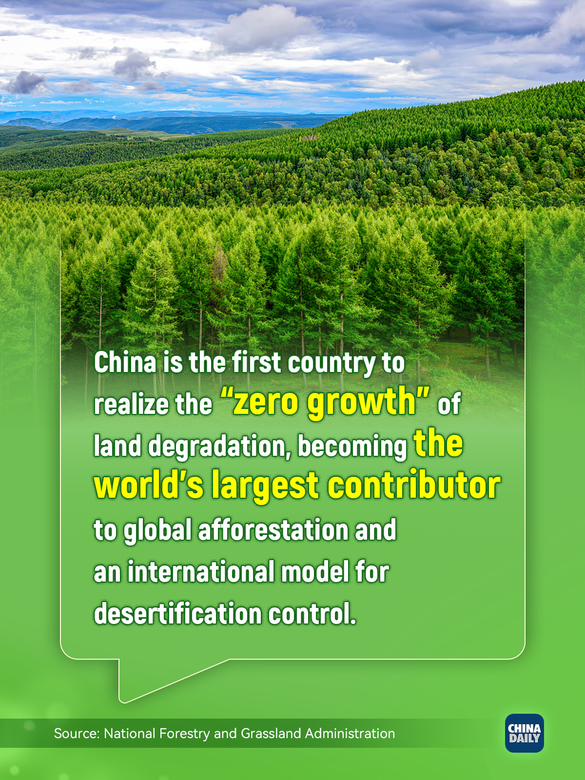 "China has taken the lead in achieving the goal of zero growth in land degradation, becoming the world's largest contributor to afforestation and an international model for combating desertification," it said.