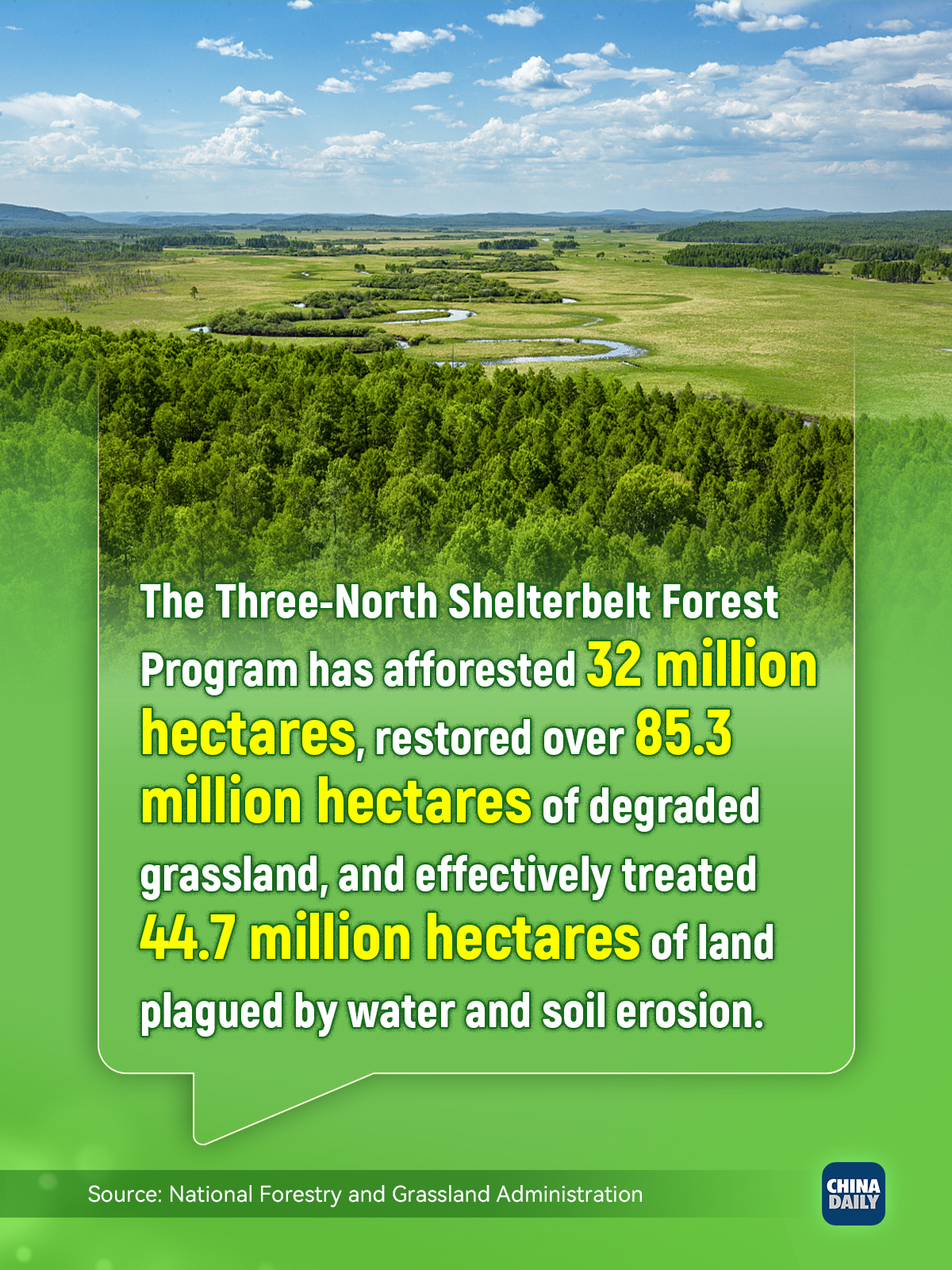 As of now, the project has afforested 32 million hectares, restored over 85.3 million hectares of degraded grassland, and effectively treated 44.7 million hectares of land plagued by water and soil erosion, as revealed by the administration.