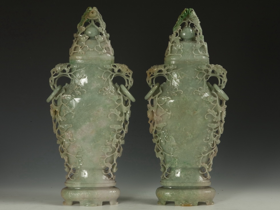 With their soft green hue tinged with pale pink, this exquisite pair of jadeite lidded vases from the late Qing Dynasty (1644-1911) brings a breath of freshness to the summer heat.