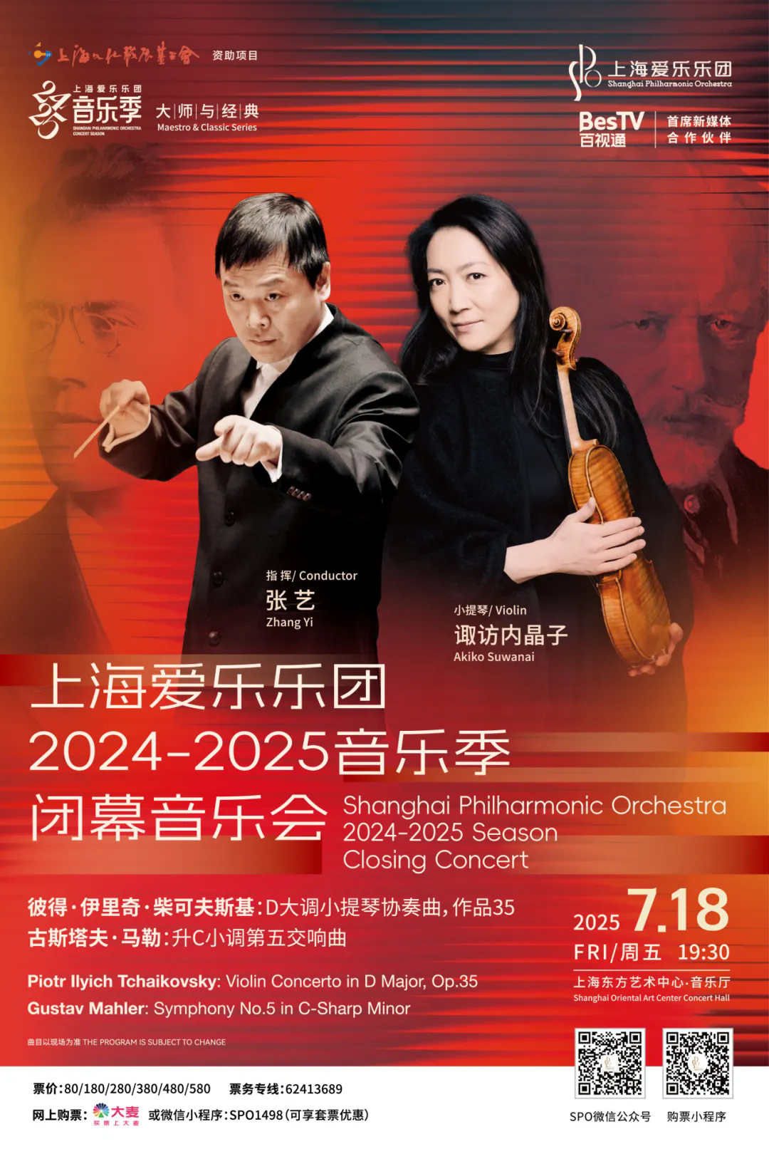 The Shanghai Philharmonic Orchestra will close its 2024-25 season with a spectacular concert led by Music Director Zhang Yi. Joined by world-renowned violinist Akiko Suwanai, they will bring the music of Tchaikovsky and Mahler to life at the Shanghai Oriental Art Center. Get ready for an unforgettable night of brilliance and emotion!