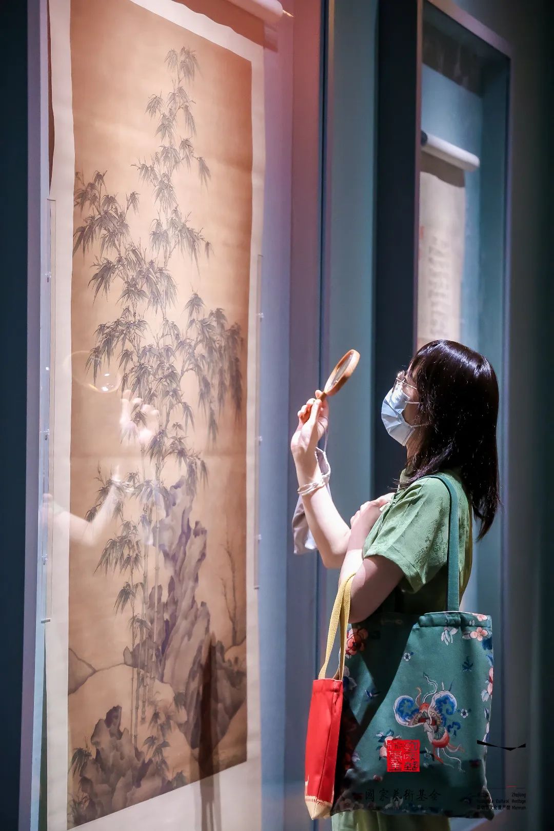A visitor admire paintings with a magnifier at Zhejiang Intangible Cultural Heritage Museum. [Photo/Zhejiang Intangible Cultural Heritage Museum official WeChat account]