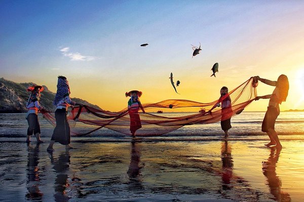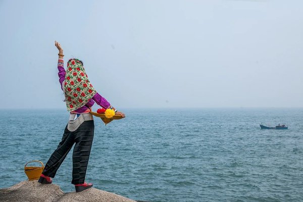 The traditional clothes worn by Hui'an women are characterized by distinct designs, vibrant colors and delicately made embroideries. As Hui'an women often work near the sea, their bamboo hats protect them from both rain and strong sunlight. Their head scarves keep them warm and help shield them from wind coming off the sea. The short jackets and loose trousers are both comfortable and convenient for the women, especially when they are working in or near the water. A Hui'an woman's clothing ensemble reflects her diligence, hardworking spirit and harmonious coexistence with her living environment by the ocean.