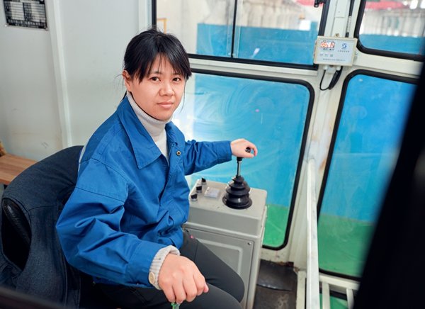 Operating a crane requires excellent skills and a strong sense of responsibility. If you ask her colleagues, they will say Jiang persistently pursues excellence. She can operate the crane to deliver an iron bucket, filled with water, along an S-shaped route without spilling a drop. She can also lift a screw cap, the size of an egg, and place it on the mouth of a bottle. Jiang obtained her senior overhead crane operator's certificate within four years of completing her training.