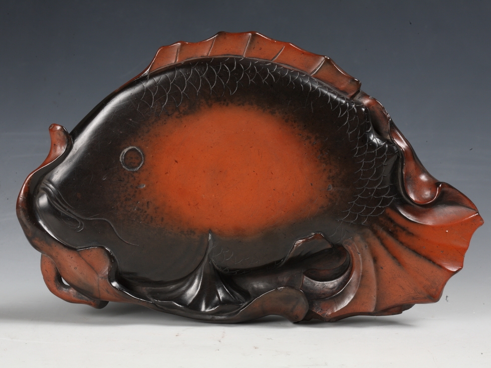 This Ming Dynasty (1368-1644) cinnabar red inkstone was made of chengni clay with a bright, lustrous color. The front face of the inkstone is sculpted in the shape of a fish, while the reverse side is formed into a black lotus leaf, conveying the traditional Chinese wish for abundance year after year (lian nian you yu).