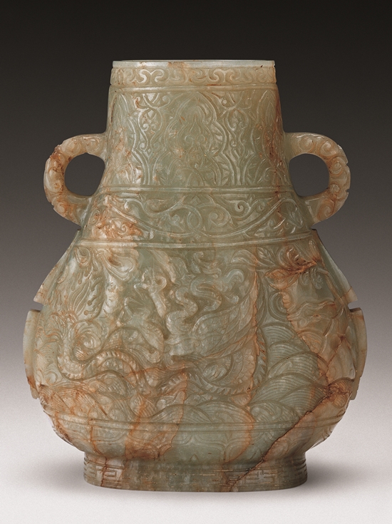 Carved from green jade with natural brownish mottling, this exquisite pot features a straight mouth and cloud-patterned half-ring handles on either side of its neck. Six layers of intricate motifs are rendered in relief and incised lines on the body, including lotus petals, leaves, and a winged dragon soaring above sea waves.