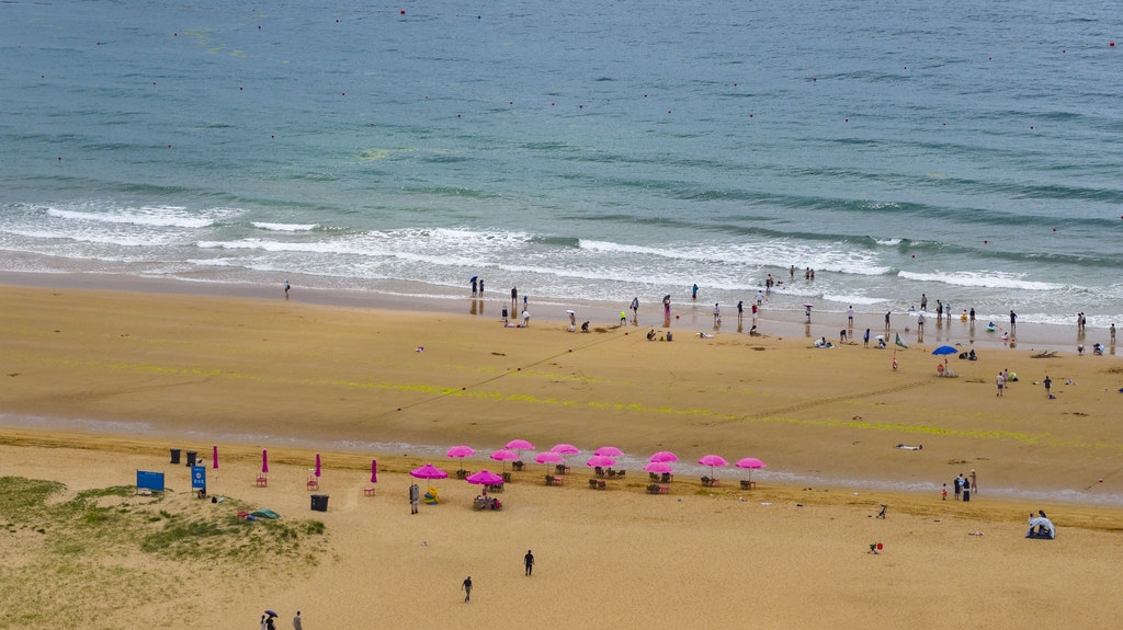 The fine, flat sands of Silver Beach in Qingdao's West Coast New Area, Shandong province, are met with gentle sea breezes, drawing crowds of visitors seeking relief from the summer heat.