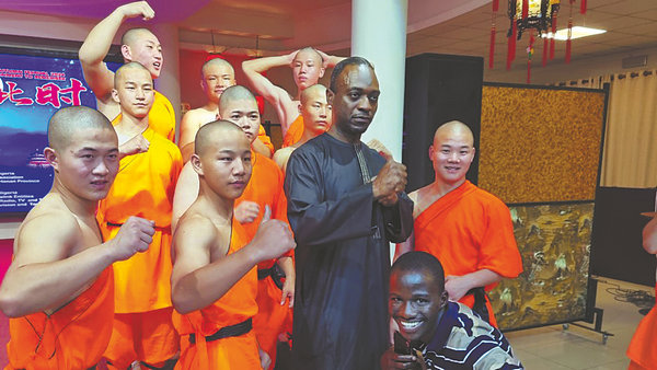 Ismaila Ikani Sule (standing, second from right) poses with Shaolin martial arts performers at the China Cultural Center in Abuja, Nigeria. [Photo/CHINA DAILY]