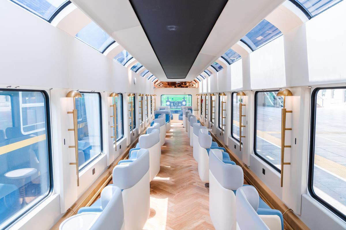 Designed as a "mobile scenic living room", the seven-carriage train offers a 208-passenger capacity, featuring five sightseeing cars (one of which is panoramic), one themed dining car, and one multi-functional entertainment car, according to China Railway Beijing Group.