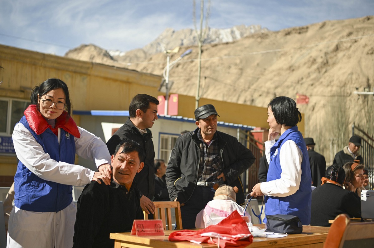 Medical workers from Shenzhen, South China's Guangdong province conduct free consultations for community residents in Tashikurgan Tajik autonomous county, Xinjiang Uygur autonomous region on March 24, 2025. [Photo/Xinhua]