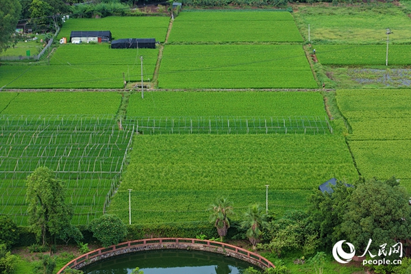 In the height of summer, the rice fields in the suburban areas of Xiamen city, southeast China's Fujian Province take on different shades of color including tender green, vibrant jade and light yellow. Viewed from above, the fields resemble a palette unfolding across the land, showcasing the romantic summer scenery of the countryside.