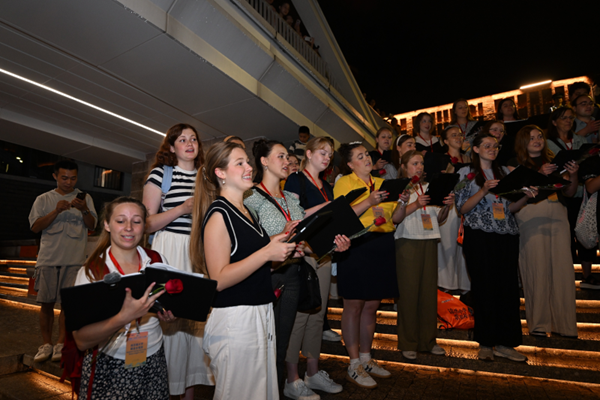 On the evening of July 10, beautiful a cappella harmonies filled the air beneath an overpass in the Yantaishan historic district of Fuzhou, Fujian province. In a captivating musical flash mob, the Brigham Young University (BYU) Select Singers Choir from the United States treated local residents and visitors to a mesmerizing auditory and visual experience, drawing an enthusiastic crowd and earning warm applause.
