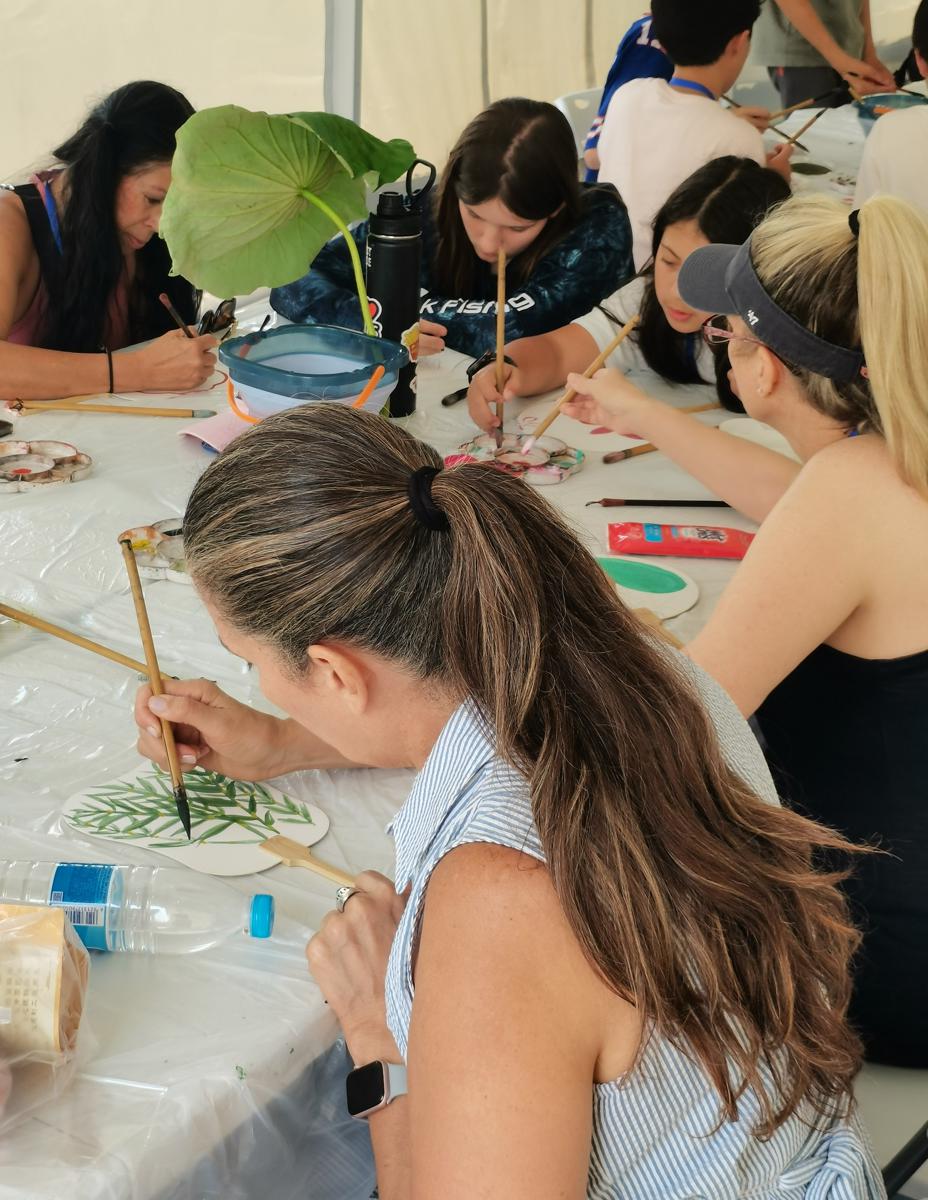 The students experienced tie-dyeing, fan painting, and other crafts under the guidance of teachers from the Tianjin Academy of Fine Arts.