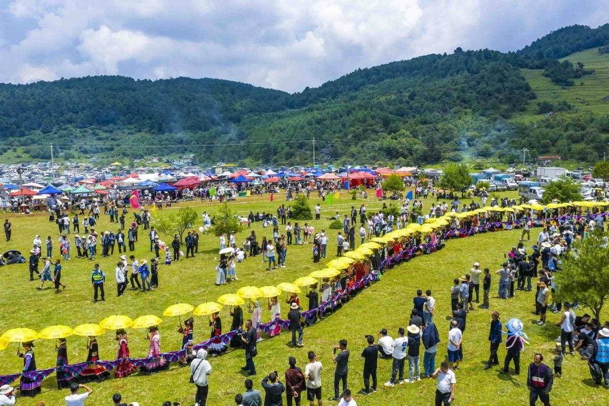 One thousand women from Yi and other ethnic groups perform Duoluohe (a traditional song-and-dance performance) during the 2025 Yanbian Ethnic Torch Festival in Yanbian county, Sichuan province, on Wednesday. [Photo by Wang Dong / For chinadaily.com.cn]