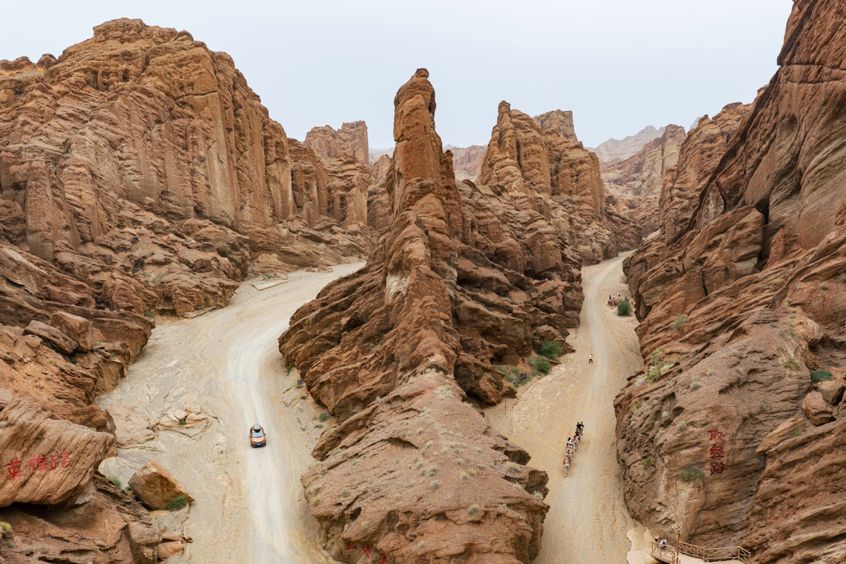 An aerial drone photo shows tourists visiting a canyon near the Duku Highway in Northwest China's Xinjiang Uygur autonomous region, July 17, 2025. [Photo/Xinhua]