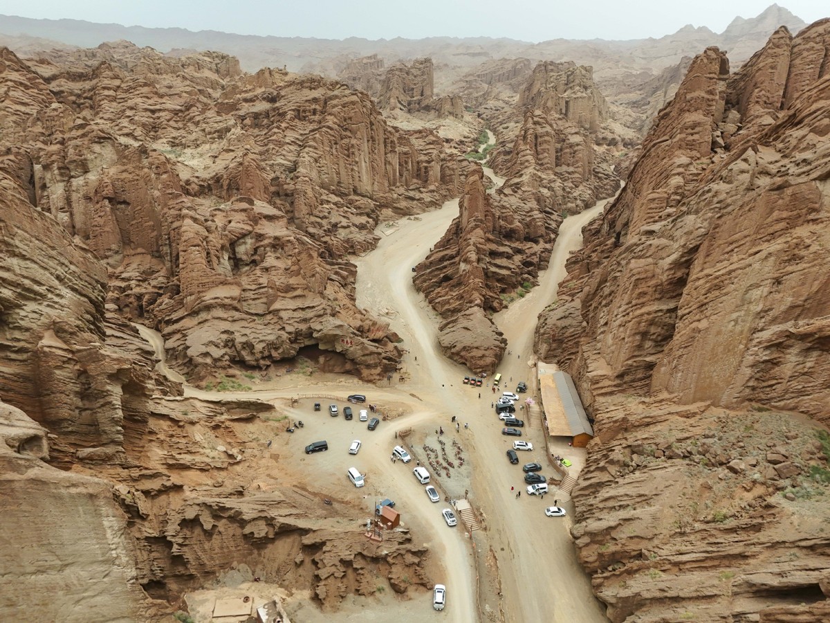This aerial drone photo shows tourists visiting a canyon near the Duku Highway in Northwest China's Xinjiang Uygur autonomous region, July 17, 2025. [Photo/Xinhua]